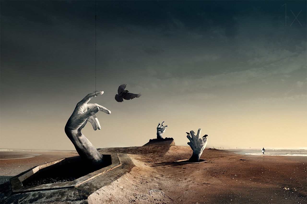 In composites like this, I always try to have something interesting in the foreground, but also in the middle and the background. A painter friend of mine told me that if we want to tell a story in our images, it's better to do it with a flow that follows our reading direction: for instance, the past is reflected in the left side of the image, and the present is reflected in the right side. I've followed that advice here, creating this surreal scene in which I want to make people think about how different our life is today compared to, for example, the horrible period of World War II. Here in the present, we live in a free country and can simply enjoy this beach. The surfer represents the concept of freedom; someone who loves nature and is free to enjoy it.